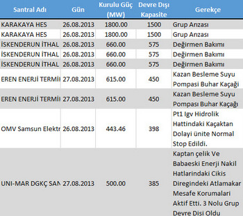 Dün itibari ile başlayan birçok santral arızasının başında Karakaya hidroelektrik santrali, Eren Enerji kömür santrali, İskenderun ithal kömür santrali, OMV doğalgaz kombine çevrim santrali ve Uni-Mar doğalgaz kombine çevrim santrali geldi. Santrallerin arıza durumları aşağıdaki şekilde gerçekleşti.