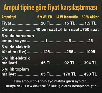 Aynı aydınlatma gücüne sahip olan üç farklı ampul modelini kıyasladığımızda LED ampuller 40 bin saatlik ömrüyle dikkat çekiyor. Bu rakam geleneksel akkor ampullerde 750 saat, tasarruflu ampullerde ise 6 bin saat olarak belirtiliyor. Bu yüzden LED ampuller günlük ortalama 10 saatlik kullanımla 5 yıllık ömre sahip olurken akkor ampullerdeyse bu rakam 1 yıldan az bir süreye denk geliyor. Elektrik tüketiminde en cimrisi yine LED ampuller. 5 yıl toplamında 126 kW’lık enerji harcayan LED ampullere karışılık akkor ampuller 1095 kW, tasarruflu ampuller 256 kW harcıyor. LED ampullerin günlük 10 saatlik ortalamayla kullanılması, tüketicilere 5 yılın sonunda yaklaşık 65 liraya mal oluyor. Bu rakam tasarruflu ampullerde 170 lira, akkor ampullerde ise 430 lira olarak belirtiliyor. Bir evde ortalama yedi ampul olacağını varsaydığımızda ise akkor ampul kullanımında toplam tutar binlerce liraya kadar ulaşabiliyor.