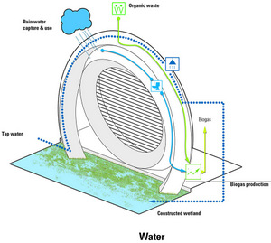 174 metrelik bir çapa sahip olan bina, kendi enerjisini üretebilmenin yanında kendi içme suyunu oluşturabilme gibi ilginç bir özelliğe daha sahip. Yağmur suyunu toplayarak depolayan bina, bunu arıtarak kullanıma hazır hale getirebiliyor. Binanın ısınması içinse organik atıklardan ve kanalizasyon sisteminden gelen diğer atıkların işlenmesiyle ortaya çıkan biyogazdan faydalanılıyor.