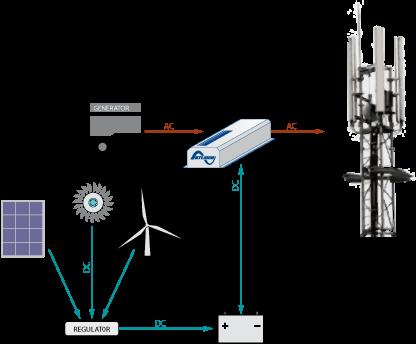 In this configuration the transmitting relay can for instance be supplied by means of renewable energy sources or of a genset for the Xtender and Compact series. Do note that the genset will be automaticaly started under certain conditions thanks to the auxiliary relays...