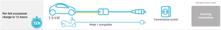Bu bağlantıda, klasik ev tipi yapısında ama klasik ev tipi prizlere göre daha yüksek akım taşıma kapasitesine sahip IP korumalı, dış ortama uygun dizaynlı, sıva üstü veya sıva altı prizler ile şarj gerçekleşir. Ortalama şarj süresi 7 saattir. Legrand Mode 2 çözümünde tek fazlı sistemler 3,2kW güce kadar desteklenmektedir.