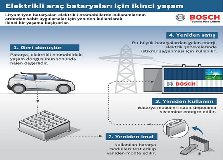 Şirket daha şimdiden bu alanda ilk deneyimlerini kazanmış durumda. Bosch, Almanya’nın Sylt adası yakınlarında bulunan Braderup’ta, ihtiyaç duyulması halinde bir rüzgar çiftliği tarafından üretilen enerjiyi geçici olarak saklamak üzere Avrupa’nın en büyük enerji depolama sistemlerinden birini inşa etti. Şirket bunu büyük ölçekli bir şebeke oluşturmak için binlerce küçük lityum-iyon bataryayı birbirine bağlayarak yaptı. Frankfurt yakınlarında bulunan Kelsterbach adlı kasabada, Bosch benzeri bir lityum-iyon depolama sisteminin bir siteye montajını gerçekleştirdi. Bu durum bataryalar için “İkinci Yaşam” projesinde de bir fark yaratıyor.